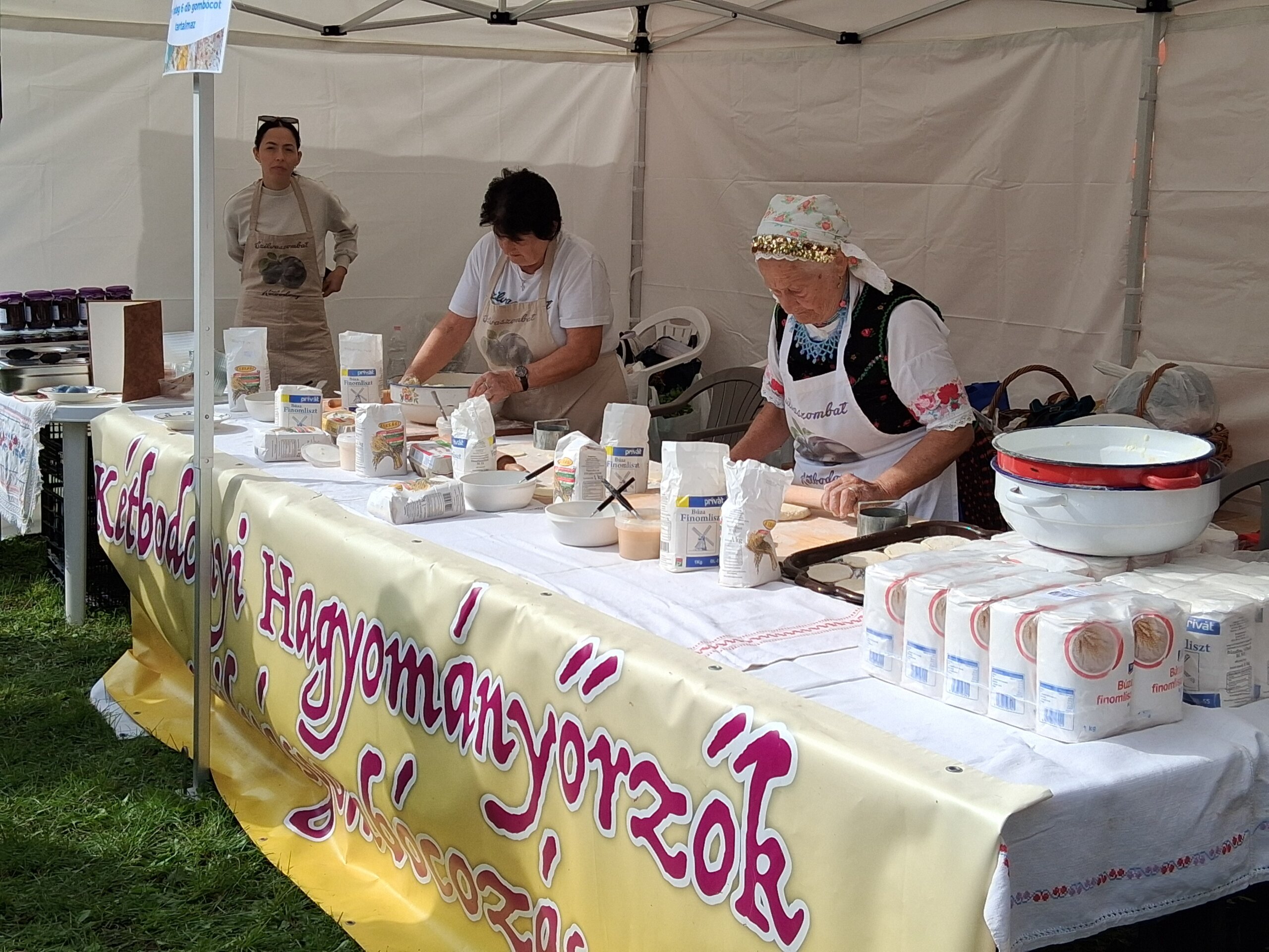 Ezúttal is folyamatos sorállás jellemezte a Kétbodonyi Hagyományőrzők szilvásgombócot és különböző lekvárokat kínáló pavilonját, ahol a megnyitás pillanatától egészen este hat óráig folyamatosan gyúrták a tésztát, főzték és porciózták a mákos és zsemlemorzsás bundába hempergetett gombócokat a fáradhatatlannak tűnő, népviseletbe öltözött szépkorú asszonyok.